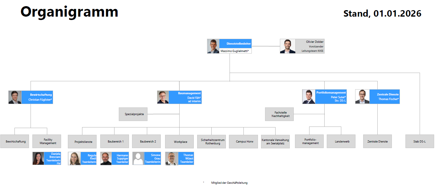 Die Geschäftsleitung ist für die personelle, finanzielle und qualitative Führung und Steuerung der Dienststelle und die Umsetzung des Leistungsauftrags verantwortlich. Sie leitet Planungskommissionen und Beurteilungsgremien, berät den Regierungsrat in Immobilienfragen, vertritt Vorlagen in politischen Kommissionen und den Kanton Luzern nach aussen. Die Assistentin führt das Sekretariat des Dienststellenleiters und der Geschäftsleitung. Sie unterstützt den Dienststellenleiter in Führungs- und Fachaufgaben und koordiniert und bearbeitet Regierungsrats- und Kantonsratsgeschäfte.